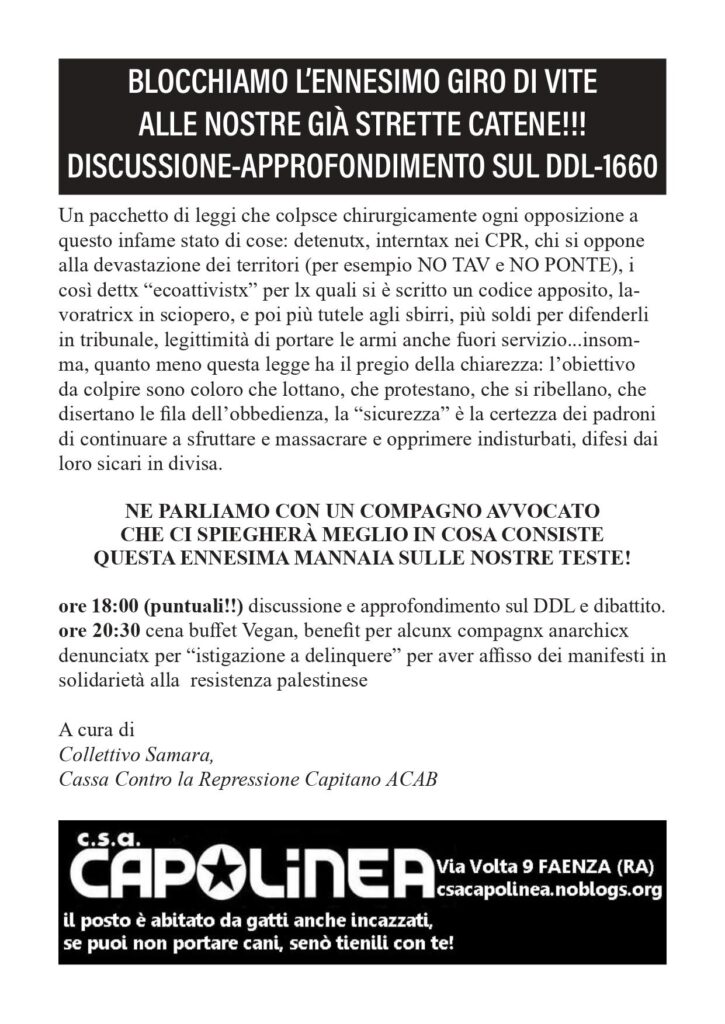 Un pacchetto di leggi che colpsce chirurgicamente ogni opposizione a questo infame stato di cose: detenutx, interntax nei CPR, chi si oppone alla devastazione dei territori (per esempio NO TAV e NO PONTE), i così dettx “ecoattivistx” per lx quali si è scritto un codice apposito, lavoratricx in sciopero, e poi più tutele agli sbirri, più soldi per difenderli in tribunale, legittimità di portare le armi anche fuori servizio…insomma, quanto meno questa legge ha il pregio della chiarezza: l’obiettivo da colpire sono coloro che lottano, che protestano, che si ribellano, che disertano le fila dell’obbedienza, la “sicurezza” è la certezza dei padroni di continuare a sfruttare e massacrare e opprimere indisturbati, difesi dai loro sicari in divisa.