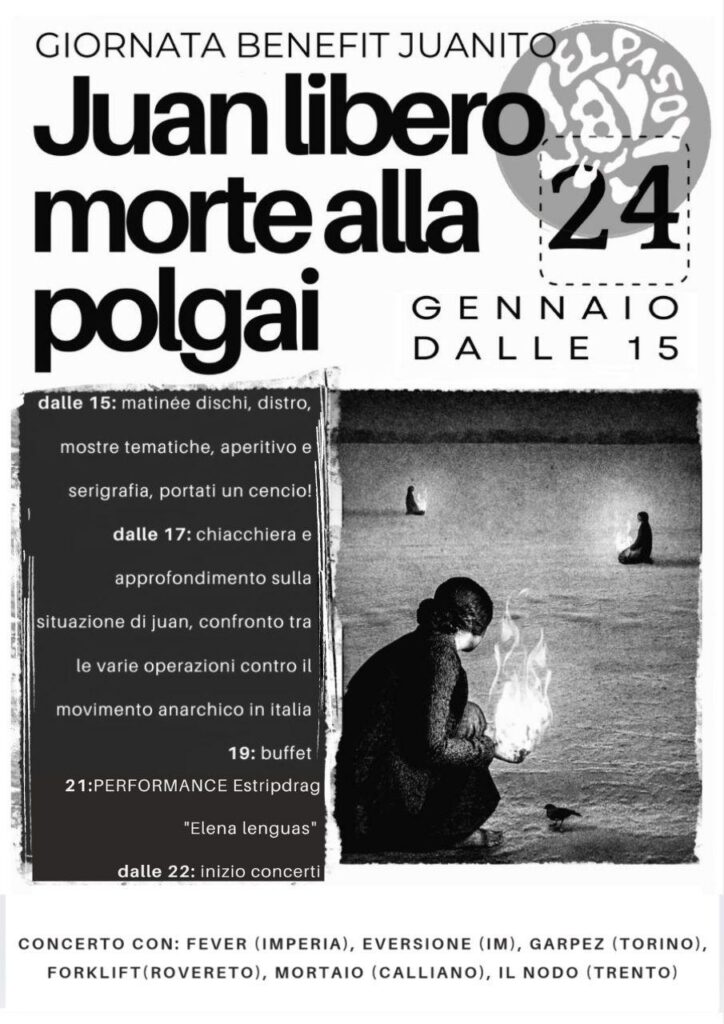 Dalle 17 chiacchiera e approfondimento sulla situazione di Juan, confronto fra le varie operazioni contro il movimento anarchico in Italia.