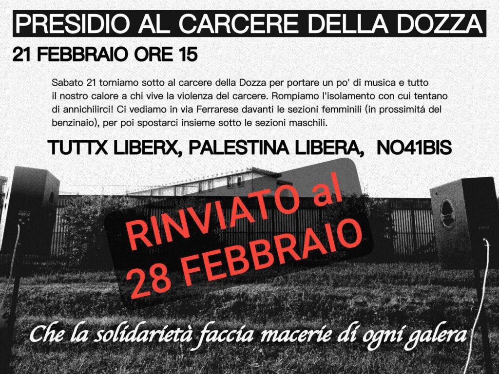 SABATO 28 febbraio torniamo sotto al carcere della Dozza per portare un po’ di musica e tutto il nostro calore a chi vive la violenza del carcere. Rompiamo l’isolamento con cui tentano di annichilirci!