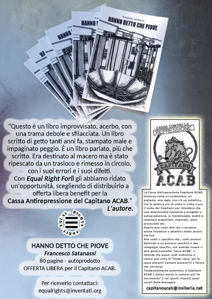 “Questo è un libro improvvisato, acerbo, con una trama debole e sfilacciata. Un libro scritto di getto tanti anni fa, stampato male e impaginato peggio. È un libro parlato, più che scritto. Era destinato al macero ma è stato ripescato da un trasloco e rimesso in circolo, con i suoi errori e i suoi difetti. Con Equal Right Forlì gli abbiamo ridato un’opportunità, scegliendo di distribuirlo a offerta libera benefit per la Cassa Antirepressione del Capitano ACAB“.