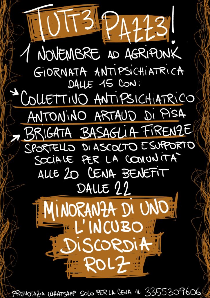 Dalle 15.00 ci racconteranno la loro storia e le loro attività il collettivo Antipsichiatricco Antonin Artaud e Brigata Basaglia Firenze